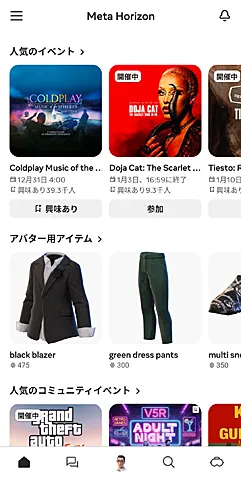 2025年12月時点では、ホーム画面はMeta Horizon Worldsのコンテンツが優先表示されています。Meta社がMeta Horizon Worldsを重視していることの表れでしょう。