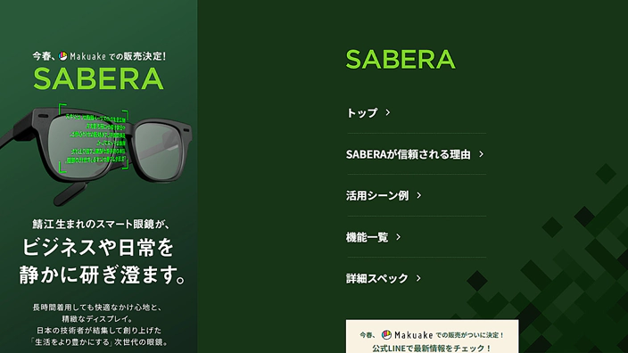 jig.jpは2026年2月20日、同社のARグラス(スマートグラス)事業において新ブランド「SABERA(サベラ)」を正式に立ち上げ、公式ランディングページを公開した。同製品は2026年春ごろにクラウドファンディングサービスMakuakeで先行販売を実施する予定だ。